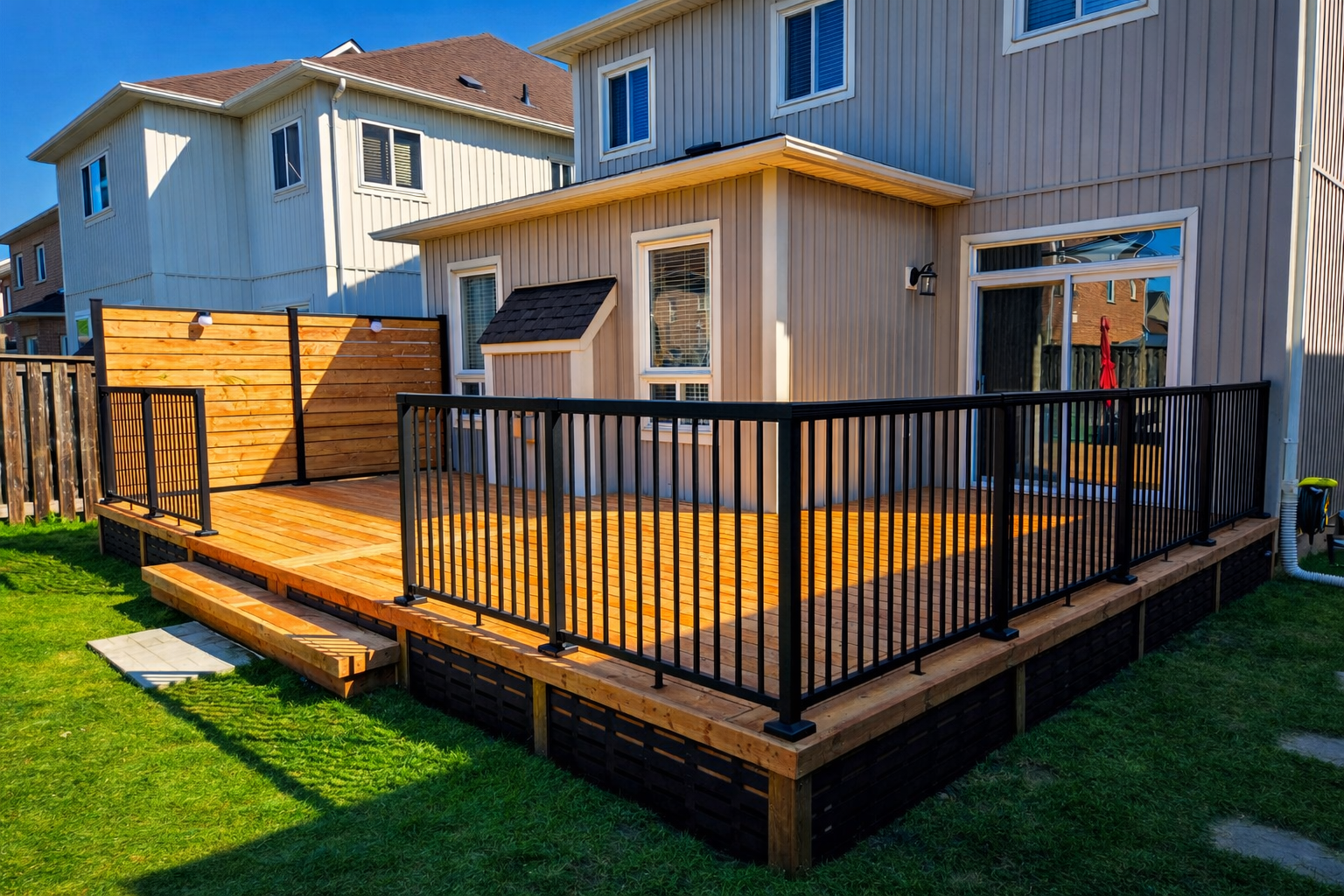 A custom deck build in Brooklin featuring black aluminum railings, integrated modernized privacy screen with an upgraded layout. Designed to expand the usable backyard space and create a more comfortable area for everyday outdoor living.