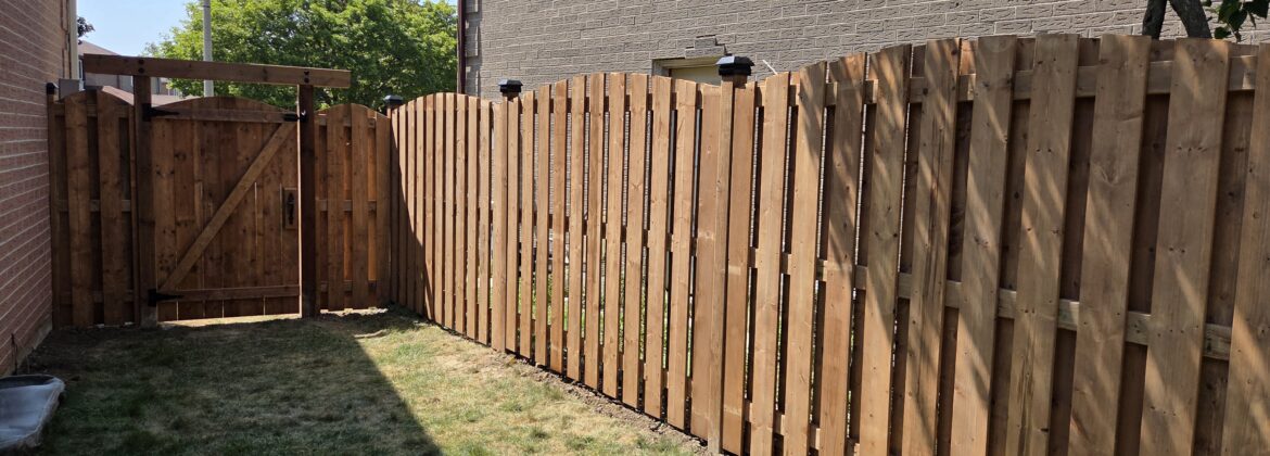 Quality Woodworks built a custom shadow box style fence with 2-inch picket spacing and two arched entry gates in Oshawa, Ontario. Built with durable 5×5 pressure-treated posts and 2×6 top support headers,this design offers a perfect balance of privacy and airflow, while the arched gates with solar lighting add a stylish, welcoming touch. This project showcases our commitment to quality craftsmanship and attention to detail in every custom fence we build across Oshawa and the Durham Region
